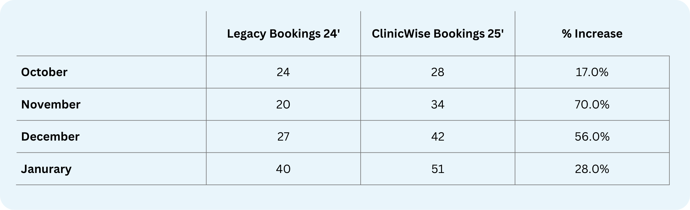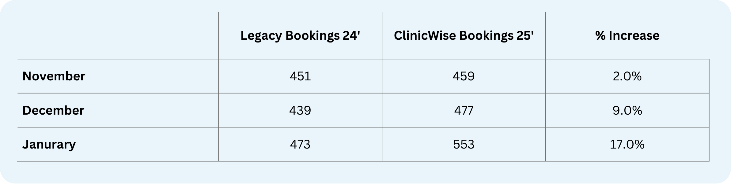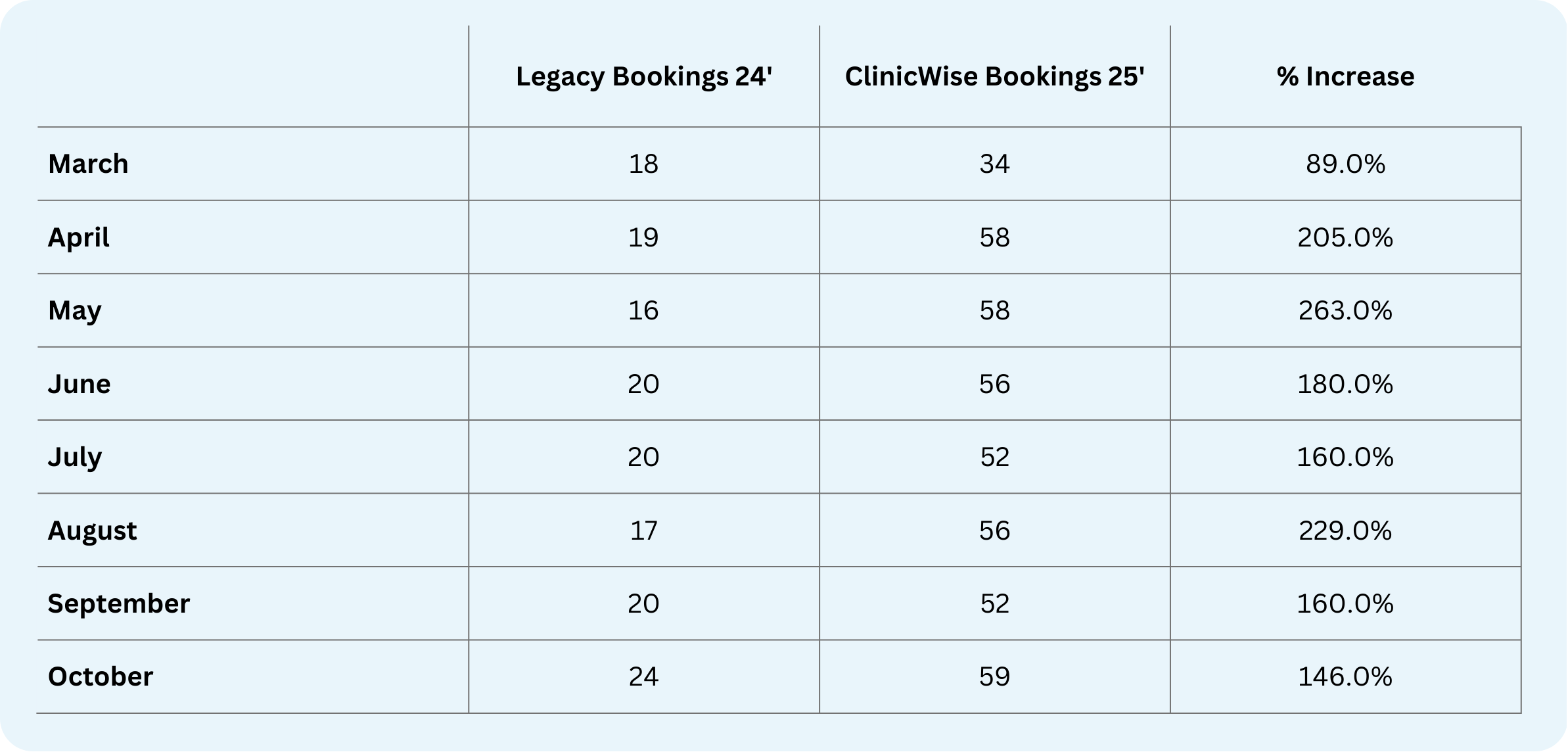 We tracked bookings across five practices before and after moving to ClinicWise. The impact was clear:
