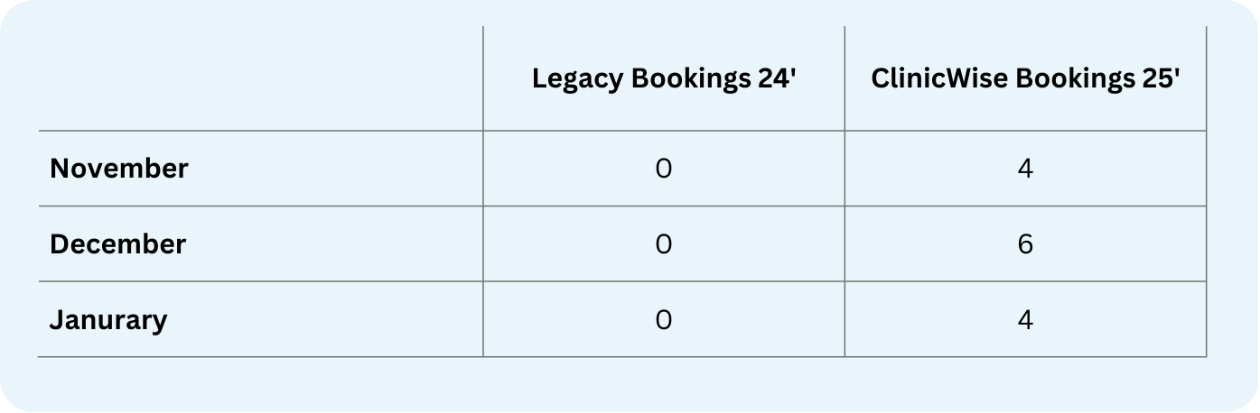 Insight: Even a small number of bookings is meaningful here. The legacy system failed to convert any interest into appointments. ClinicWise captured demand that was previously lost.